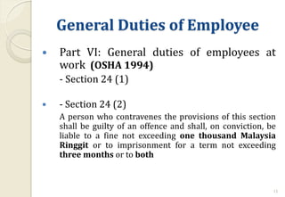 General duties of employees at work. The offence under Section 151 of the Occupational Safety and Health Act 1994 provides for a fine of up to RM50000 or a jail term of up to two years or both on conviction. FMA 1967 VS OSHA 1994 FMA 1967 OSHA 1994 Scope Only cover OSH in the manufacturing mining quarrying works of engineering and construction Cover 24 of the man power Cover all economic activities government except armed forces seafarers Cover 90 of the man power Approach - Prescriptive - Too dependent on government - Concern for.