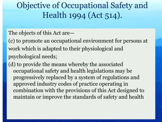 . Objectives of Act are. Examples of case law in occupational safety and health local and overseas. OSHA 1994 Seksyen 22 Huraian Seksyen 20 dan 21.